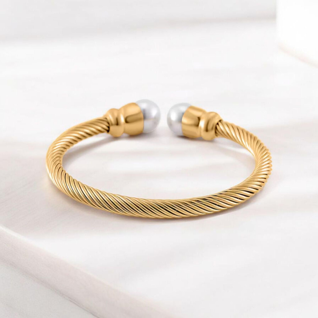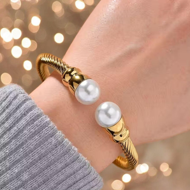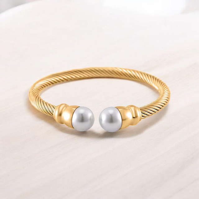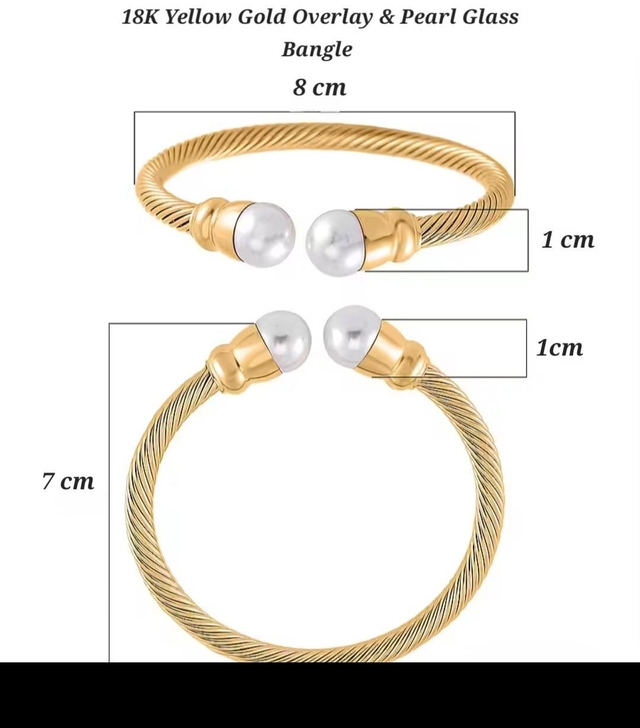 This high quality bangle is crafted with the finest highest quality of hypoallergenic Steinless Steel with an luxurious shimmer overlaying of 18K Yellow Gold Plated, the bangle is embellished with two beautiful cabochon pearls glass in each end of the bangle, giving a stylish look to the piece.