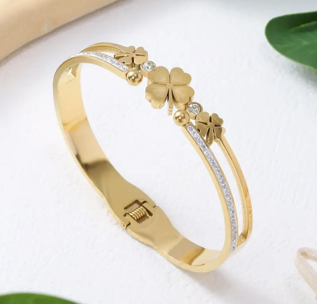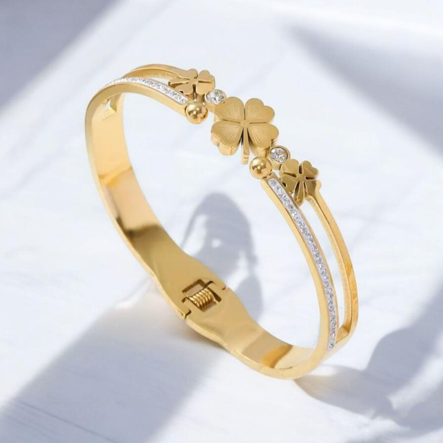 This beautiful unique clover design Bangle is made with the highest quality of hypoallergenic Titanium and 18K Yellow Gold Plated to give a long-lasting shimmer and durability to the piece, embellished with colourless Swarovski Zirconias to give a luxurious touch.