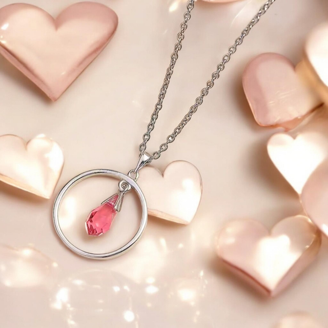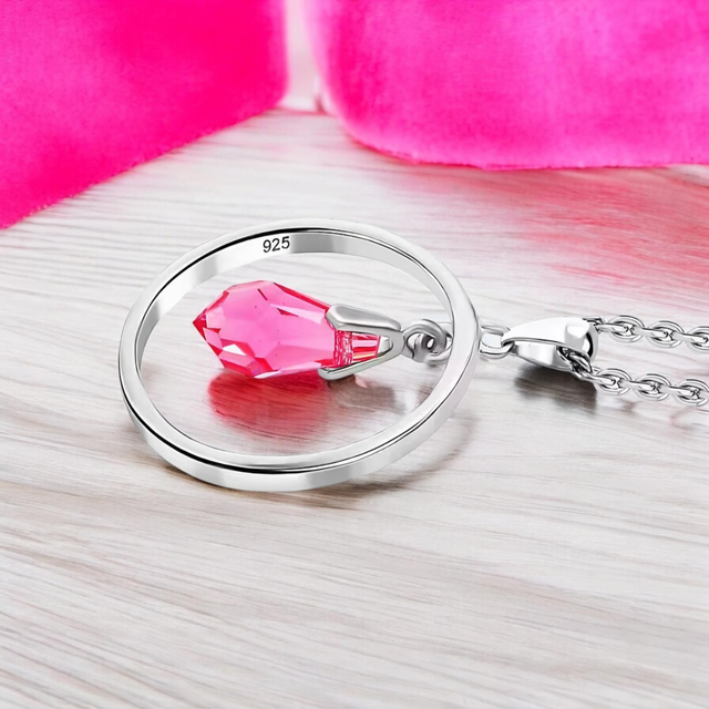 Rose Finest Crystal Drop in Checkerboard Cut. The Rose Fuchsia Quartz Crystal Drop Pendant is a sonnet dedicated to the rosy hue of dawn. Matinee length chain (Size 20) completes the ensemble of this necklace.