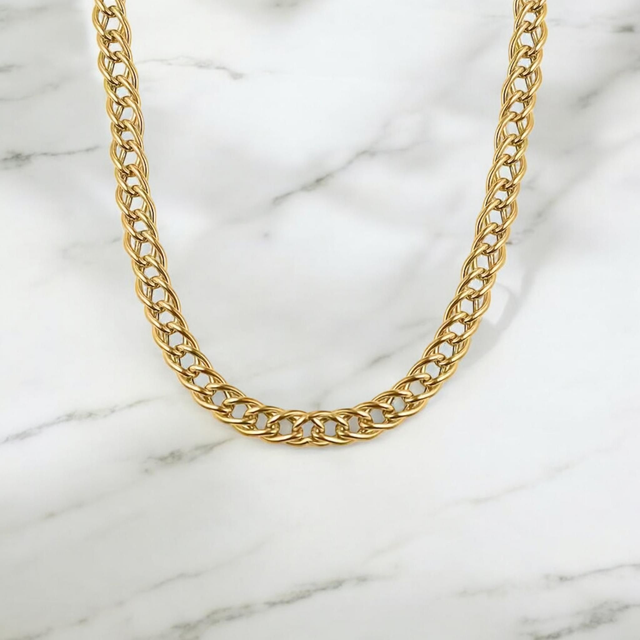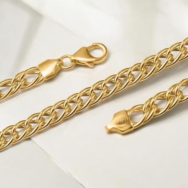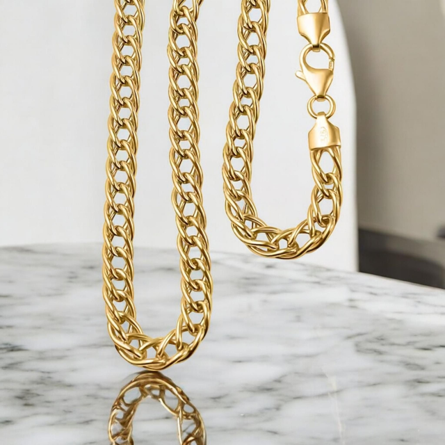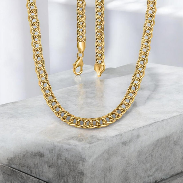 This chain has substantial silver weight and meticulously interlocked links. The bold gleaming look is definitely a head turner. The piece is all handcrafted with the highest quality of Italian 925 Sterling Silver. The chain is easy to secure with a lobster claw clasps. 18K Yellow gold overlay lends a defining festivity to the minimalist chain. This chain has a matinee length of 20 inches, perfect for highlighting the neckline.