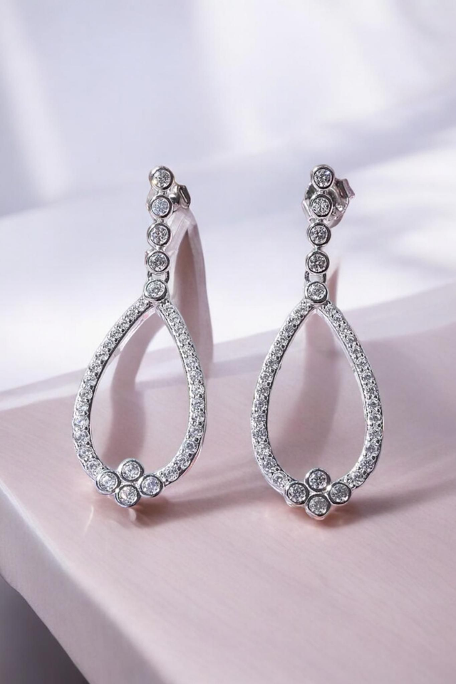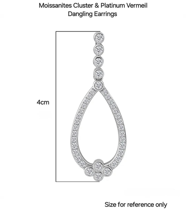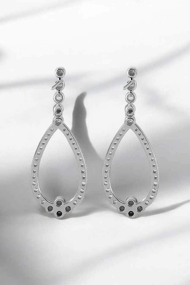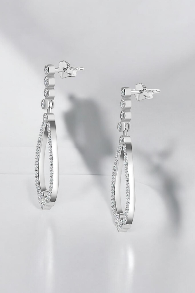 These White Moissanites Drop Earrings in Platinum filled overlay on Italian Sterling Silver are the epitome of classic beauty. Each earring showcases a brilliant array of the Moissanites, cascading down like droplets of light. The platinum overlay provides a mirror-like finish that enhances the stones’ radiance, while the sterling silver base offers timeless appeal and strength for a long-lasting durability. This pair of earrings are the perfect addition to your jewellery collection.