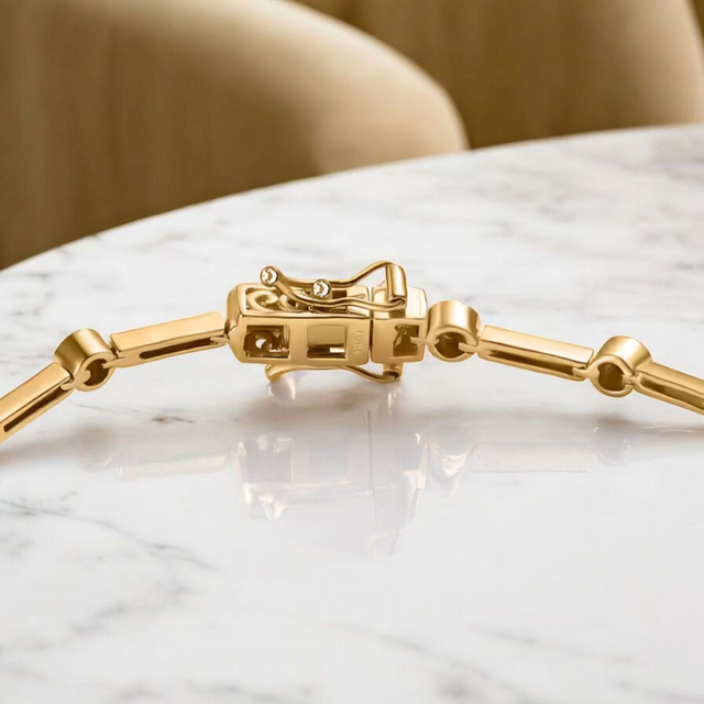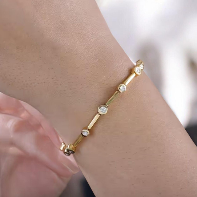 The bracelet is adorned with 5 White Diamond Rounds (0.9mm) in a Single Cut. Bezel setting of the diamonds allows them to radiate freely with their incandescent sparkle. Crafted with the highest quality of Italian pure Yellow Brass mimics the luxury of 18K yellow gold filled in a polished finish, the bubbles design is crafted in Platinum filled. The bracelet size is 7.5 inches length, the bracelet snaps onto your wrist effortlessly with a box clasp.