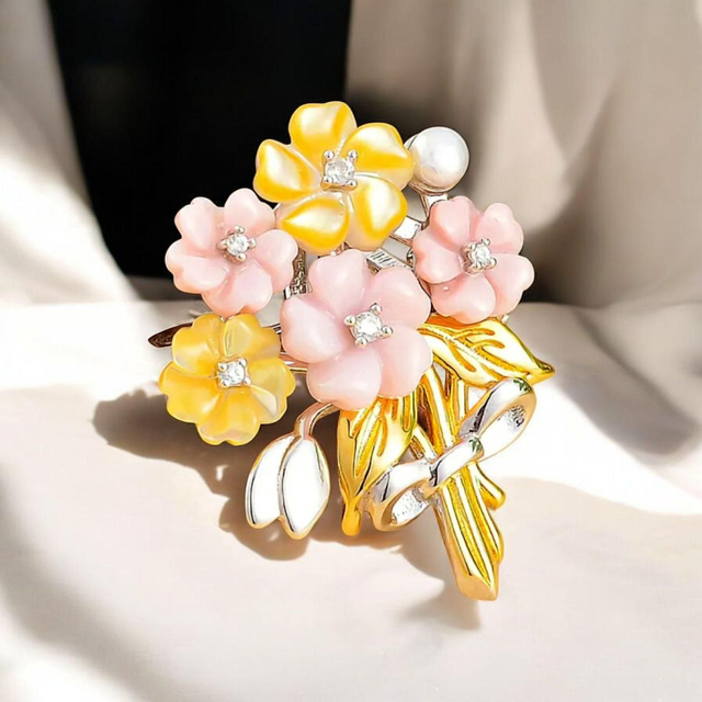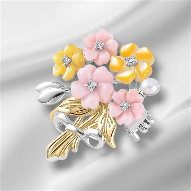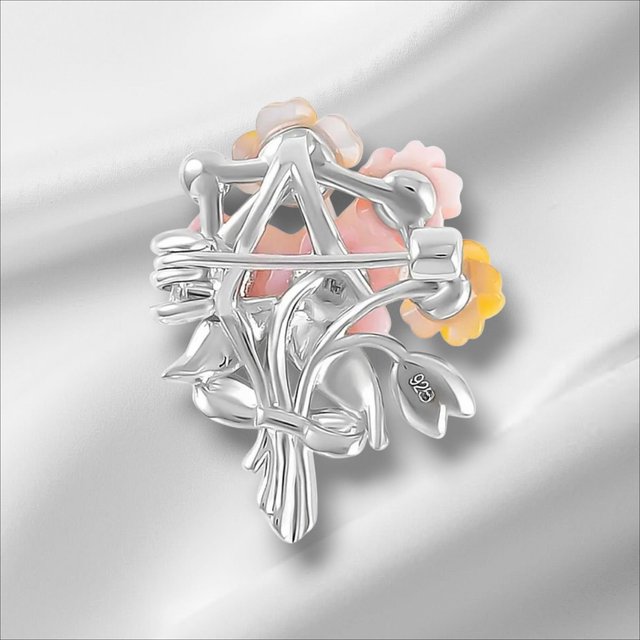 The Bouquet pendant handmade from Italian 925 sterling silver looks classy. The flowers on the pendant are carved from pink and yellow Mother of Pearls. Dual finish of 18K gold and rhodium looks gorgeous.