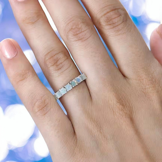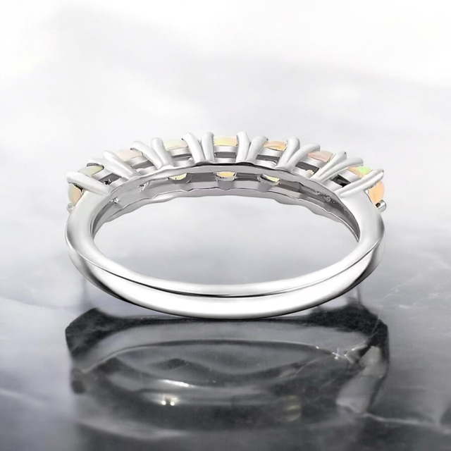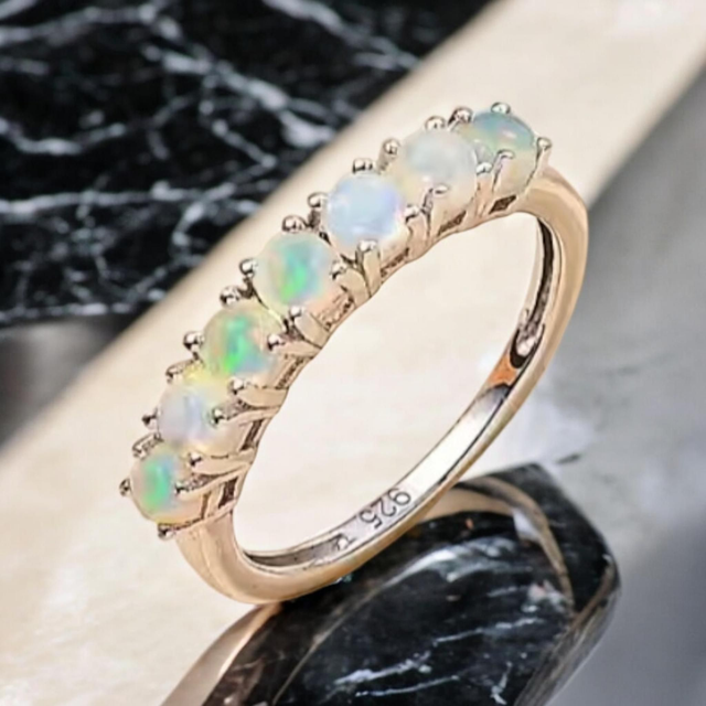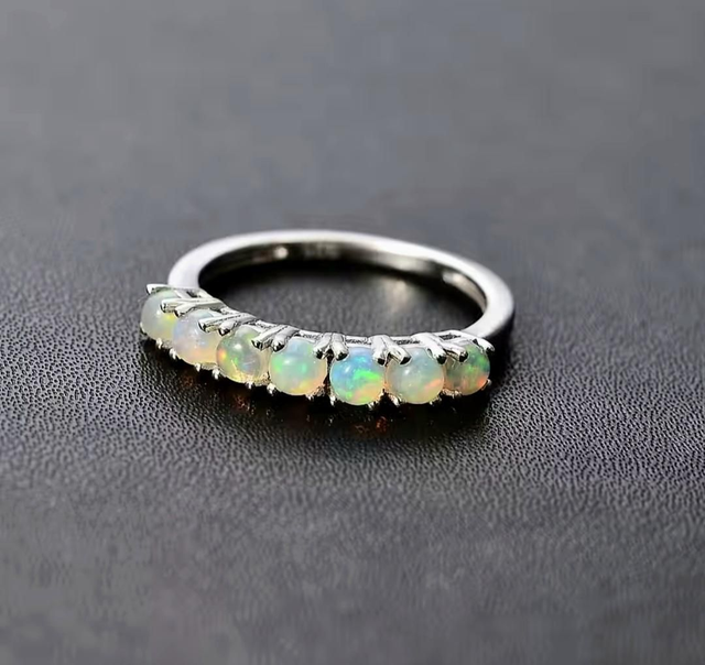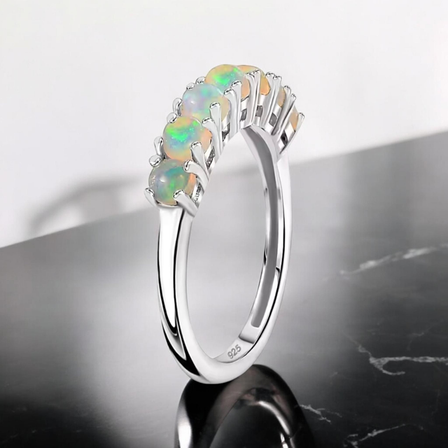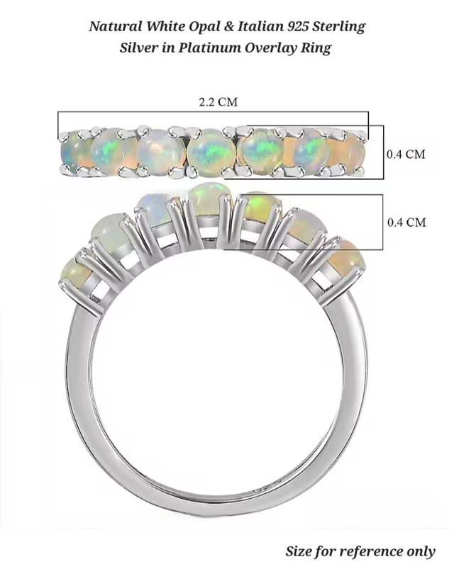 Dressing yourself up is fun and easy with the plush look of this 7 stones ring featuring Ethiopian Natural White Opal cabochons of precise cut and size. The ring featuring a Platinum Overlay on Italian 925 Sterling Silver, comes with an exemplary shine that catches the eye. The rainbow hues of the opal gemstones are amplified by the platinum finish of the ring. Ring Size O.